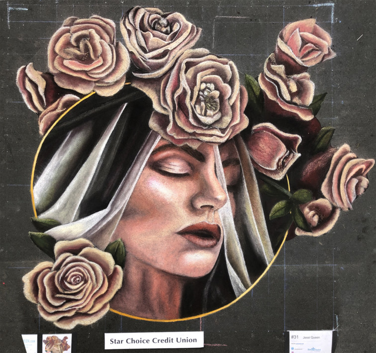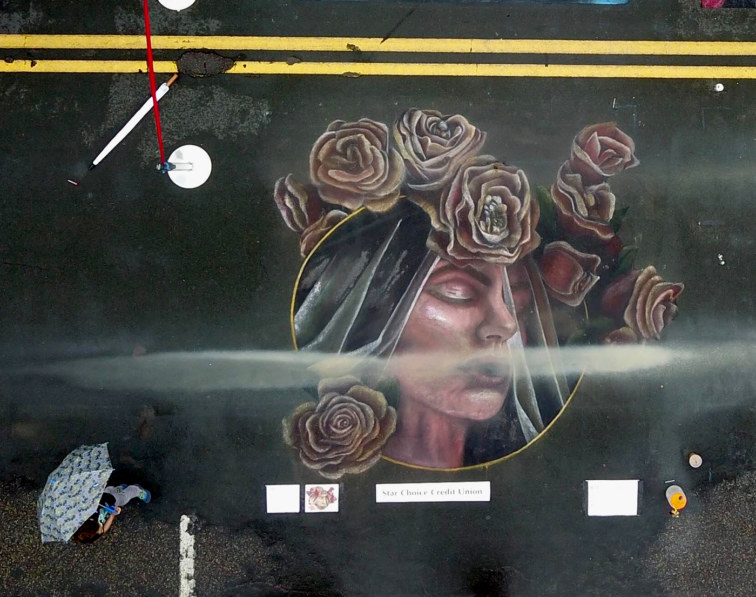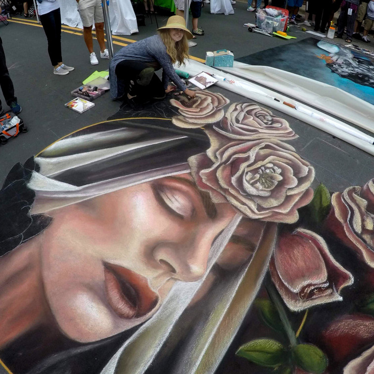 Street painting in Arbor Lakes this year was a race against the weather. Everyone chalked beautiful drawings that ranged anywhere from 3D bees and flowers to the genie from Aladdin. I challenged myself by drawing a lady with a veil at a 3/4 face angle. I focused on the roses by drawing each petal with care and meticulous detail. I finished just in time to capture photos. Then we got to experience the beautiful breakdown of our drawings in the rain. This ephemeral nature is what I love the most!