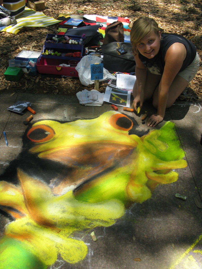 The Savannah Sidewalk Arts Festival is a great opportunity for SCAD students to get together and decorate Savannah’s largest central park. This past weekend us Atlanta students ventured down to Savannah for a day filled with fun, art, and music. Zachary came along for moral support. He helped me to decide what to draw. I chose a beautiful yellow tree frog to render on my square. I was pressed for time but was able to rekindle my love for the fine art medium. I finished by 2pm with only minutes to spare. Though I did not win the competition, it was rewarding enough seeing the smiles my art left on the faces of all who passed by. People were amazed at what I drew on the sidewalk and my favorite moments were all the young children who were not interested in walking through the park being pulled along by their parent’s hands, but would stop and yell “Look a frog! He goes ‘ribbit’!!”. These small moments made me smile and made my day worth while. I enjoy art for this very reason and find that it is something I do not make enough time for and hope to do more of in the future.