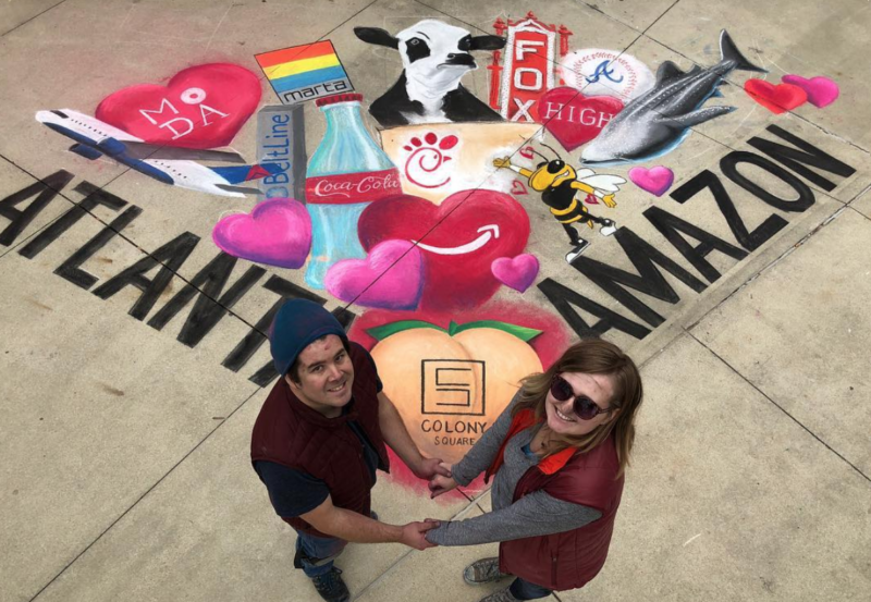 We often collaborate with Colony Square on chalk projects. They are working to reimagine their prominent location in order to make it a work, play, live environment in the heart of Midtown Atlanta. My favorite spot is next to the Midtown sign and we were thrilled when we were invited to chalk next to it. This project was led by Meg Mitchell of Everlong Creative. We created a chalk drawing to promote the Amazon Treasure Truck for Valentine’s Day. We were able to bring all that we love about Atlanta into one drawing to show how Atlanta loves Amazon. Meg came up with the idea and I put together a few images to reference. You can see my mock up below.
